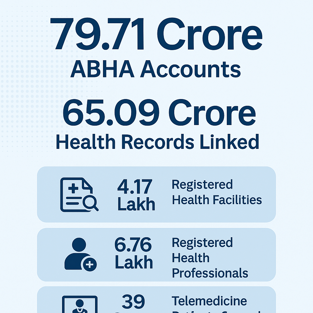 India has reached a big step in digital healthcare. By July 28, 2025, the government created 79.71 crore Ayushman Bharat Health Accounts (ABHA). Out of these, 65.09 crore health records connect directly to the IDs. Health Minister Prataprao Jadhav announced the figures in the Lok Sabha.