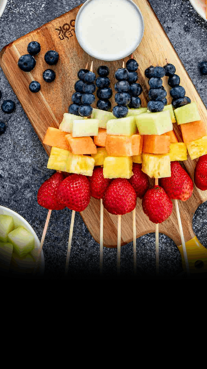 Cut your favorite fruits and sprinkle some salt and spices like cinnamon and black pepper on them. Alternate each fruit on a skewer and enjoy the delicious fruit snack.
